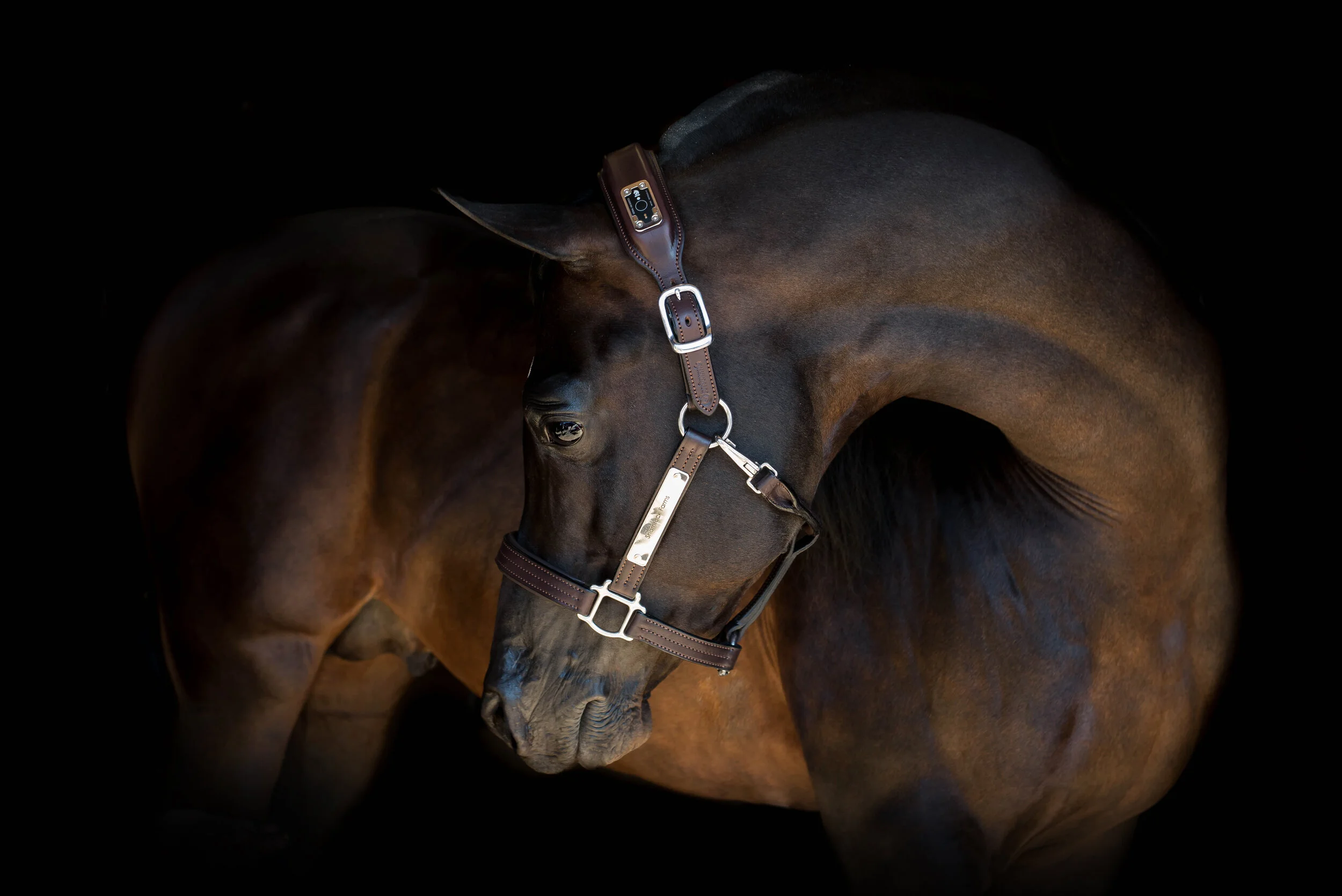 The NIGHTWATCH® smart halter™ is a safe and comfortable all-natural leather breakaway with ~2.1 ounces of technology that monitors real-time data on your horse's biometrics (heart rate and respiration) and behavior (activity level); alerts you via text, phone, and email; works across 3G cellular and 2.4 GHz WiFi networks; offers GPS/geolocation; and leverages artificial intelligence/machine learning to adapt to your horse over time for maximum precision and benefit.